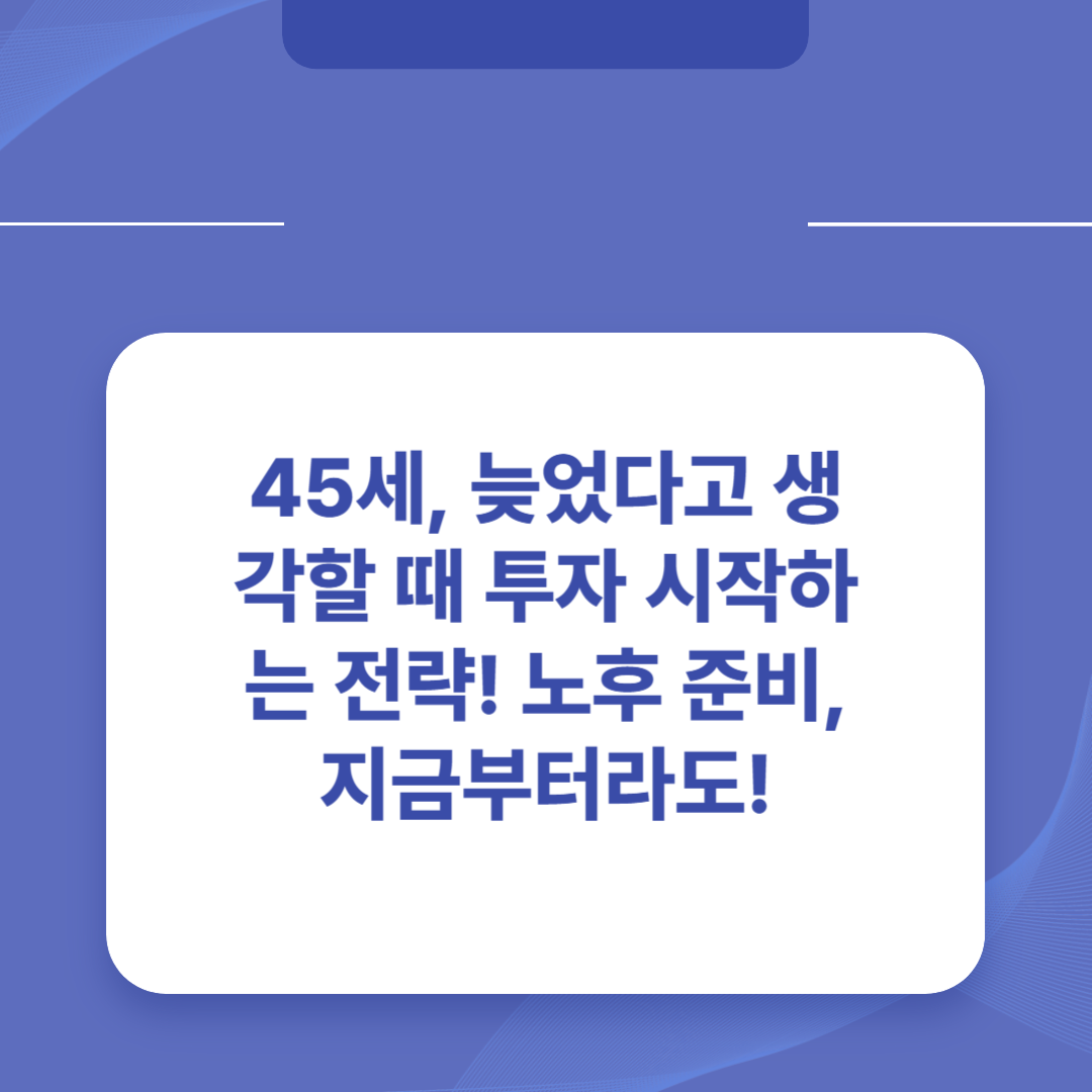 45세에 투자를 시작하는 것은 결코 늦은 것이 아닙니다. 오히려 지금부터라도 현명하게 투자 전략을 세우고 꾸준히 실천한다면, 충분히 노후를 대비하고 재정적인 자유를 누릴 수 있습니다.